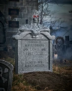 Eternal Rest is an animatronic sold by Spirit Halloween for the 2023 Halloween season. It resembles a tombstone, adorned with a female figure slumped over the top. When activated, crying can be heard, followed by the figure’s head turning around to reveal a skull with lighted red eyes as a piercing scream can be heard.