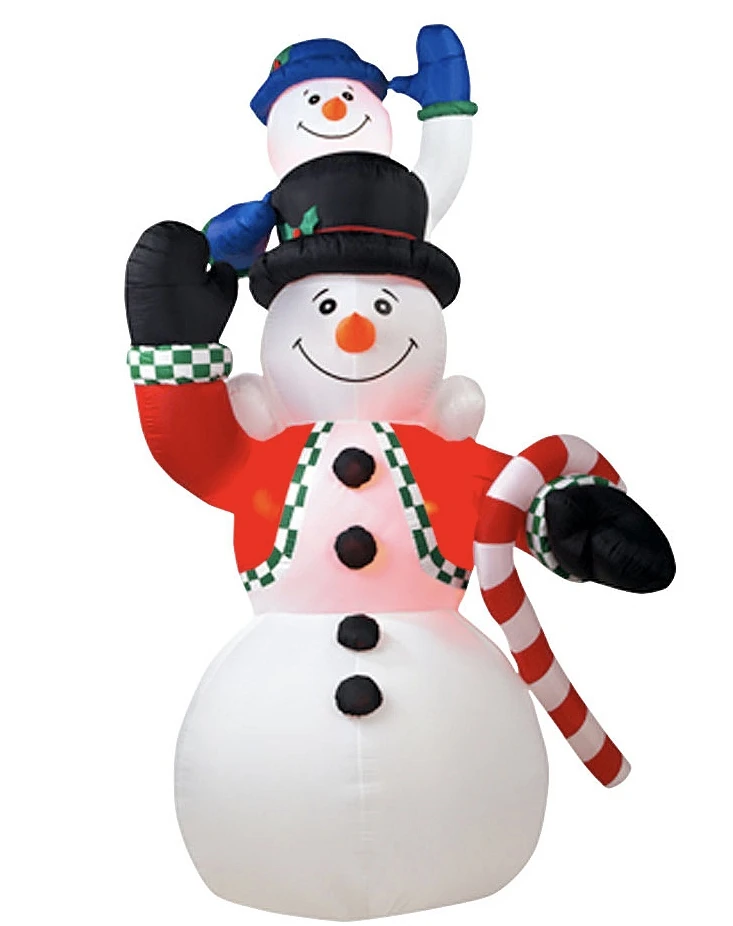 The Giant Airblown Inflatable Snowman was an inflatable decoration sold online by Spirit Halloween for the 2008 Christmas season. It resembled a giant snowman wearing a red outfit and holding a candy cane, waving. A smaller snowman wearing a blue outfit was sitting on the shoulders, waving. When plugged in, the decoration inflated and lit-up.