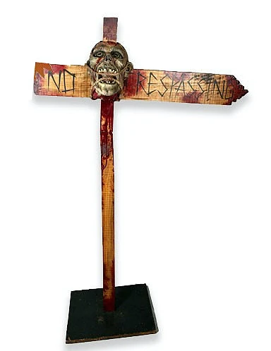 The Head on a Sign Post was a prop sold by Spirit Halloween for the 2007 and 2008 Halloween seasons. It resembled wooden post topped with a bloodied sign reading "NO TRESPASSING" and a zombie head bound with rope between the two words.