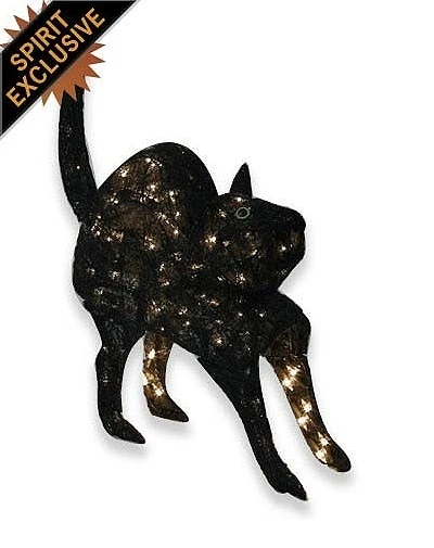 The Twine Black Cat Light was a lighted decoration sold by Spirit Halloween for the 2006 Halloween season. It resembled a large black cat with an arched back, made up of black and grey twine material. When plugged in, the cat lit-up.